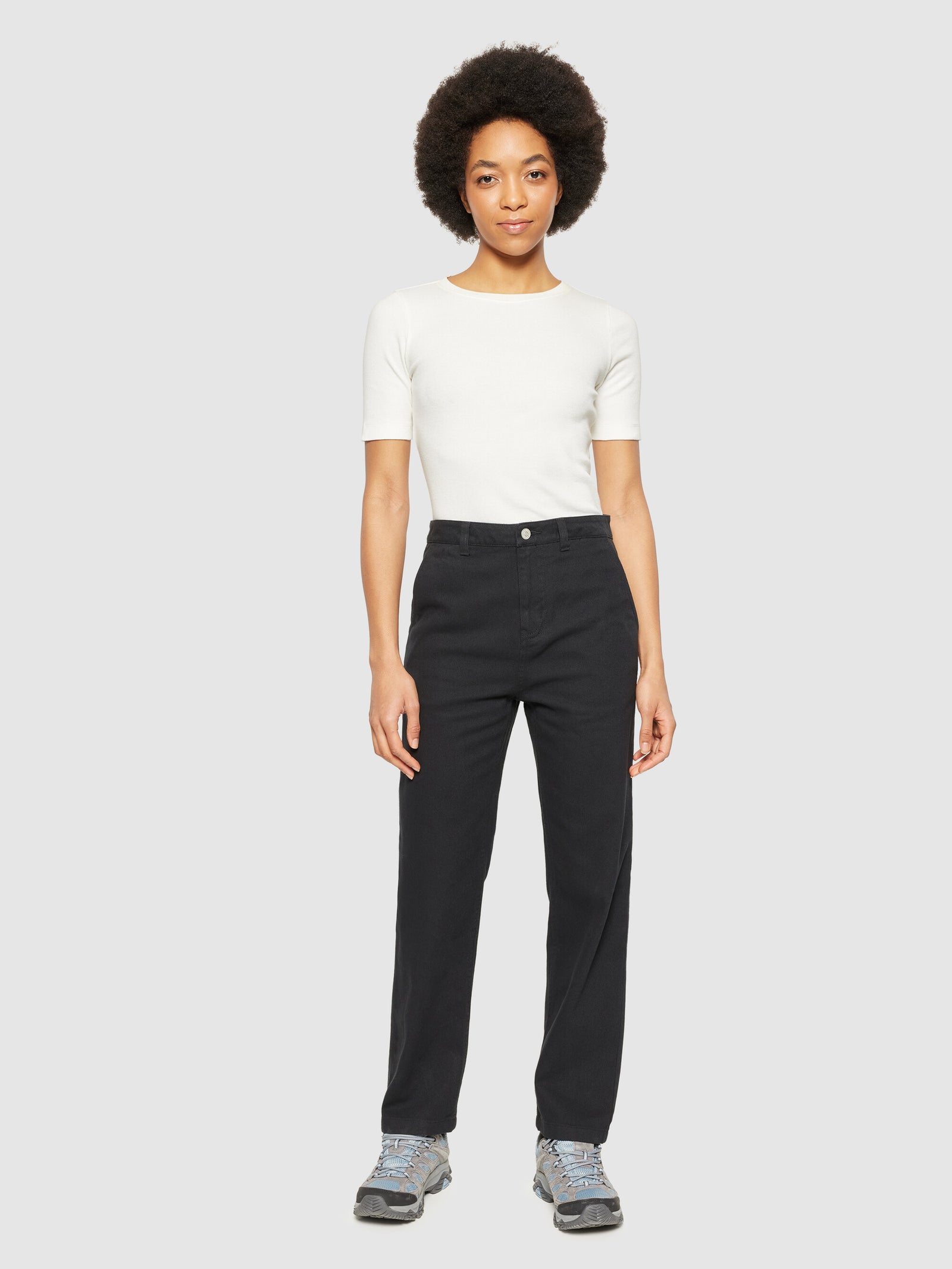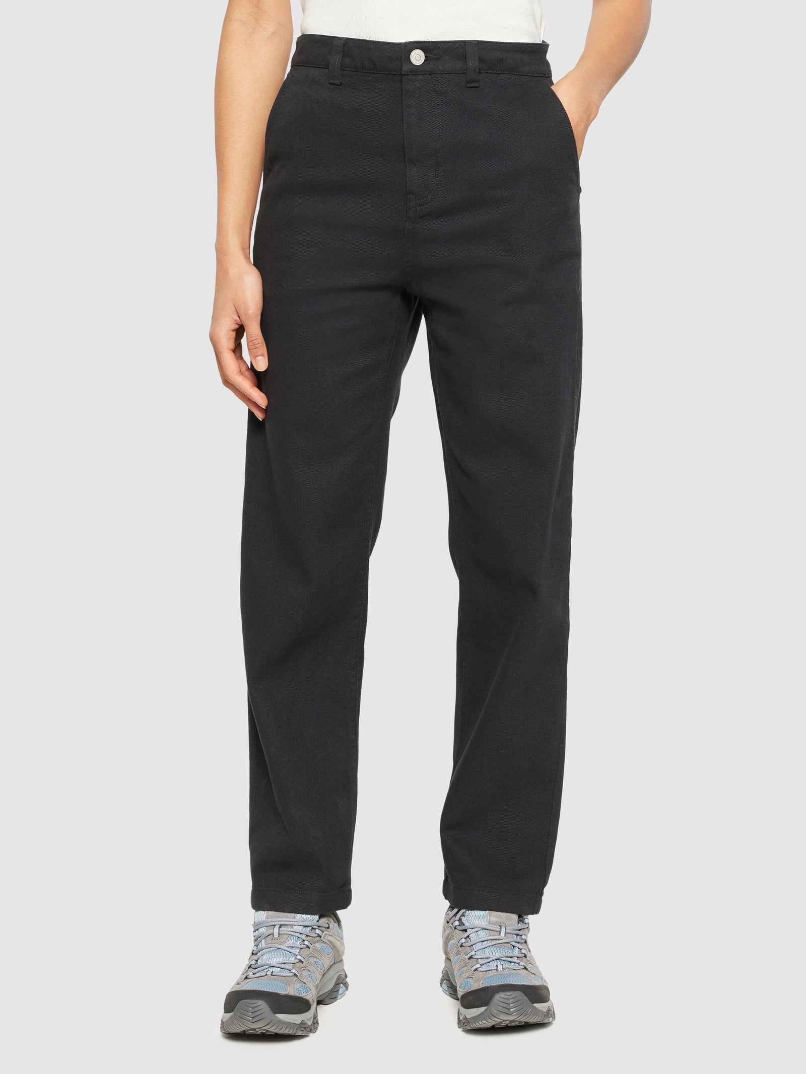 The CALLA workwear pants are a great staple for your everyday wardrobe. The mid-rise pants are made of organic twill cotton that is comfortable to wear and will last through seasons. The pants have a tapered fit, slanted front pockets, back pockets, belt loops, and button-closure.Style no. 2070047