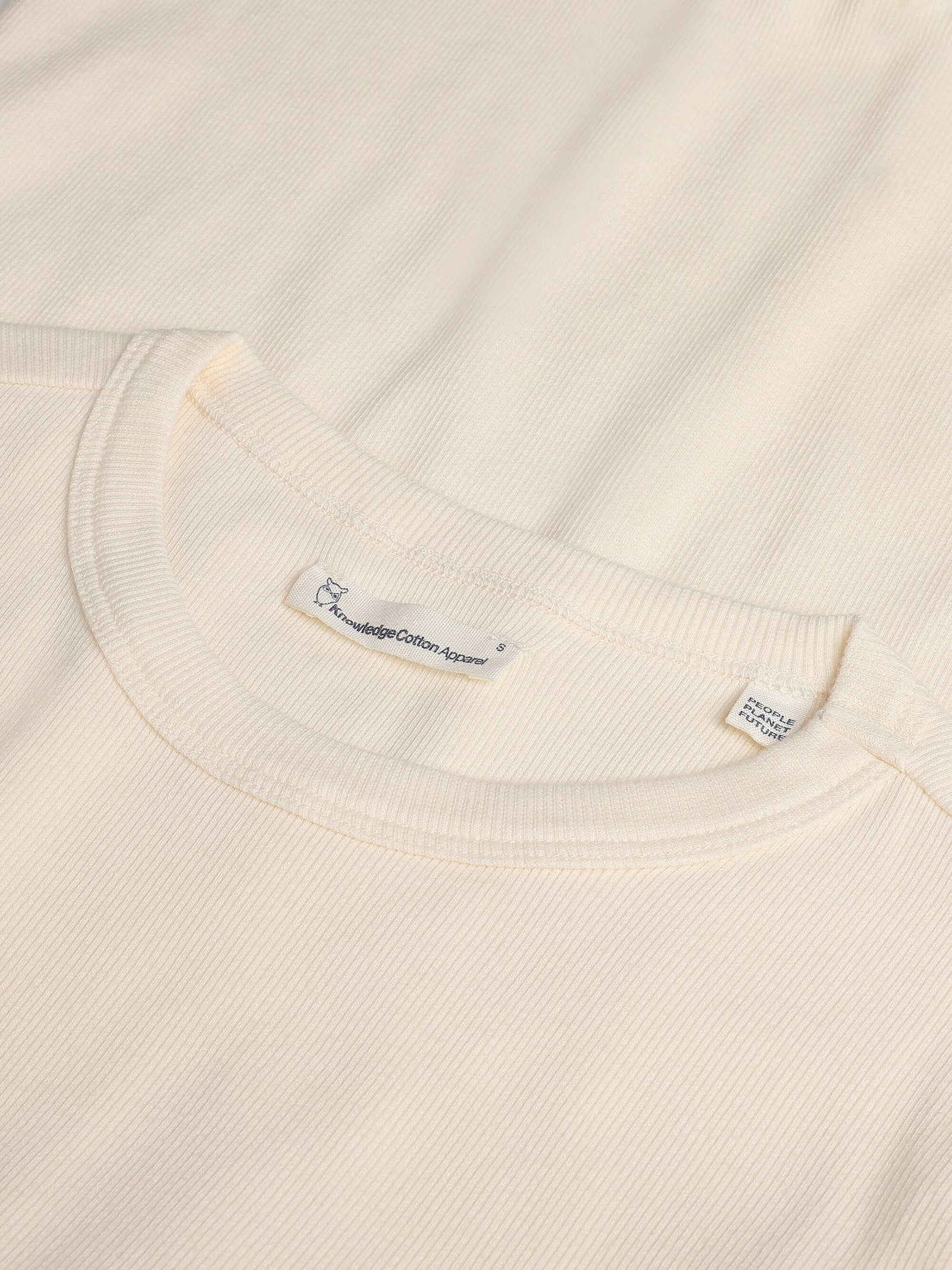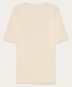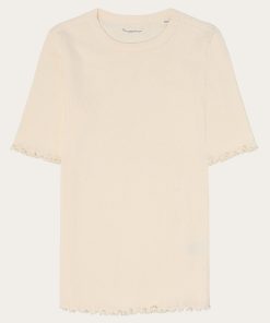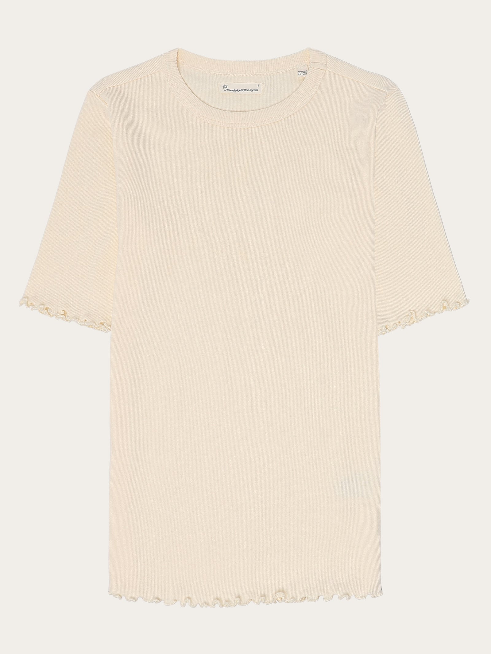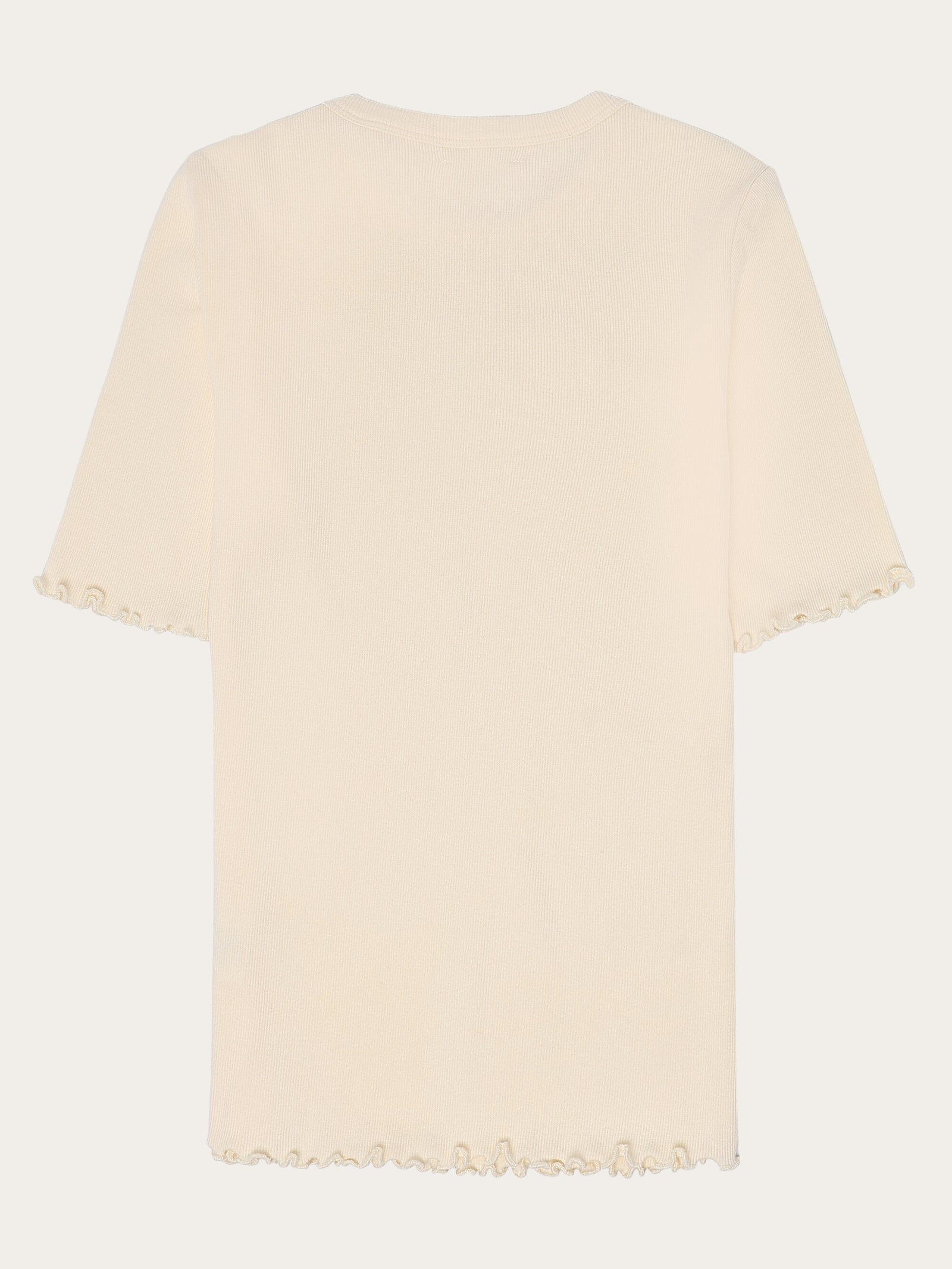 Add a stylish touch to your wardrobe with this fitted T-shirt, crafted from 100% organic cotton for a soft and breathable feel. Designed with delicate lettuce-edge detailing on the sleeves and hem, it brings a feminine and modern twist to a classic silhouette. The ribbed texture enhances comfort while providing a flattering fit. Perfect for layering or wearing on its own, this versatile piece pairs effortlessly with jeans, skirts, or shorts for an easy, everyday look.Style no. 2010067