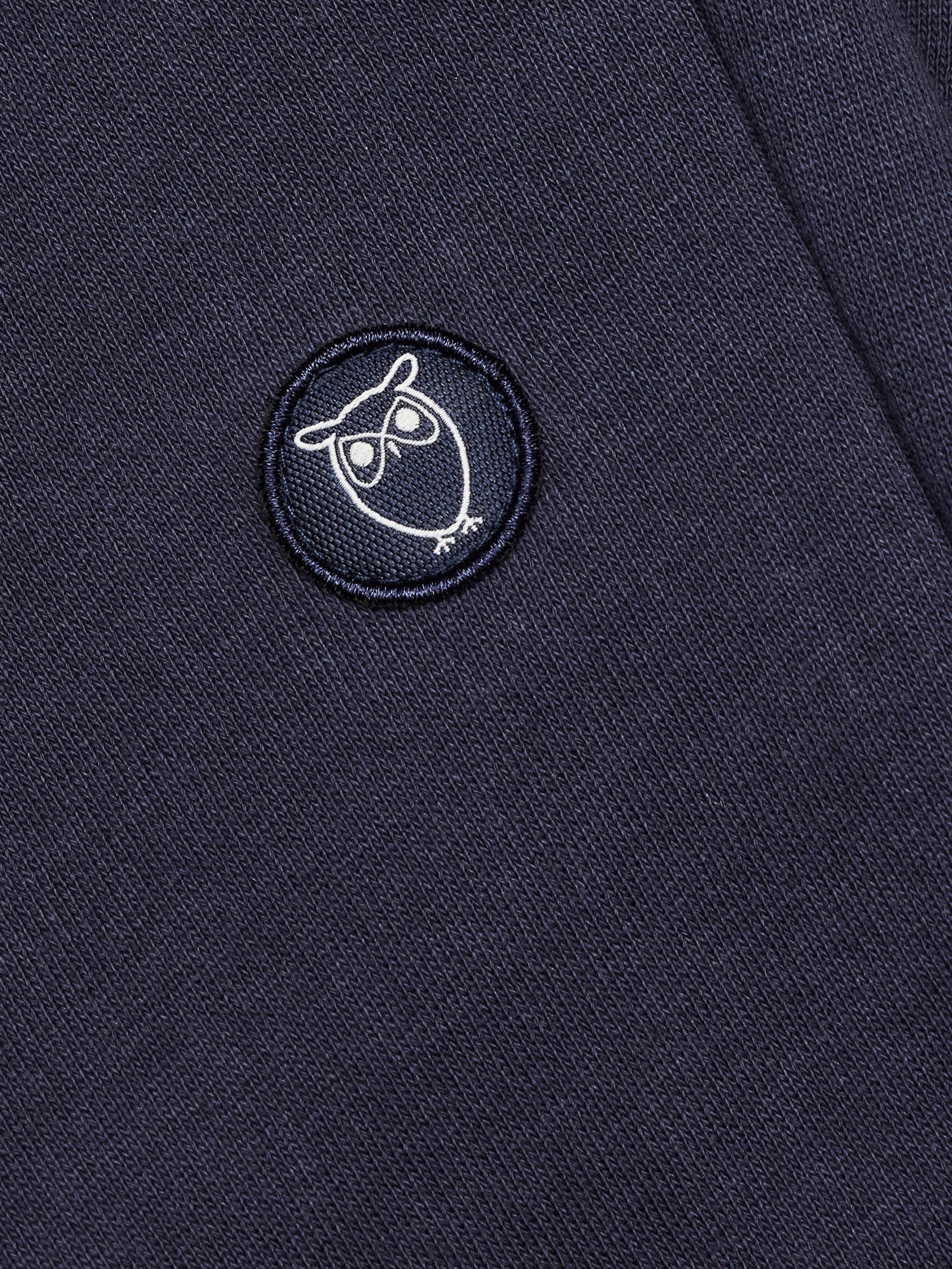 It features ribbing at leg opening and accented with a tonal owl-embroidered patch on the pocket.