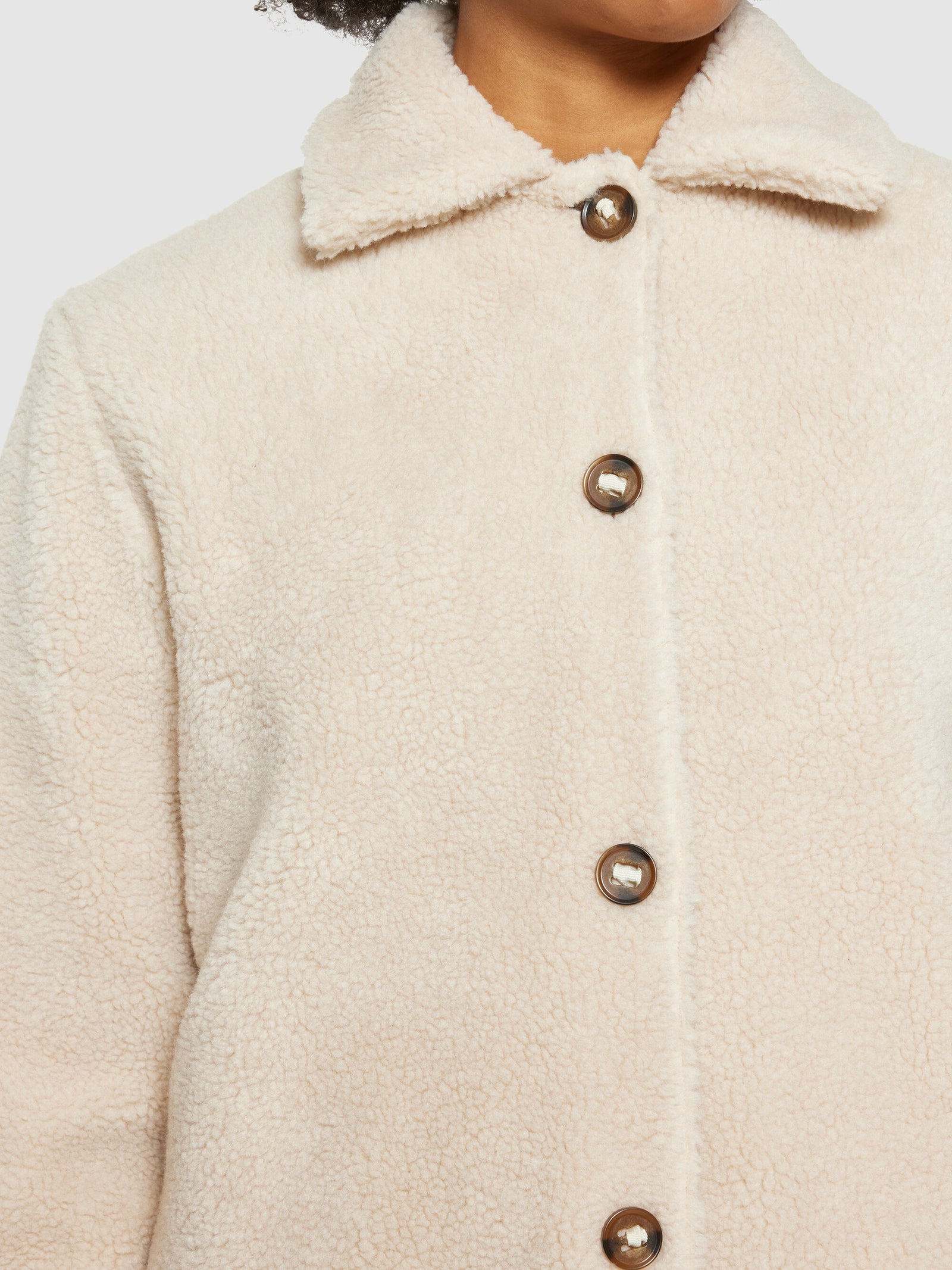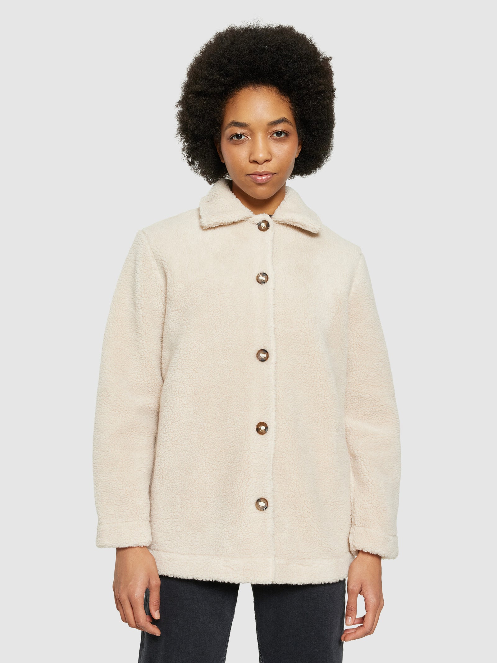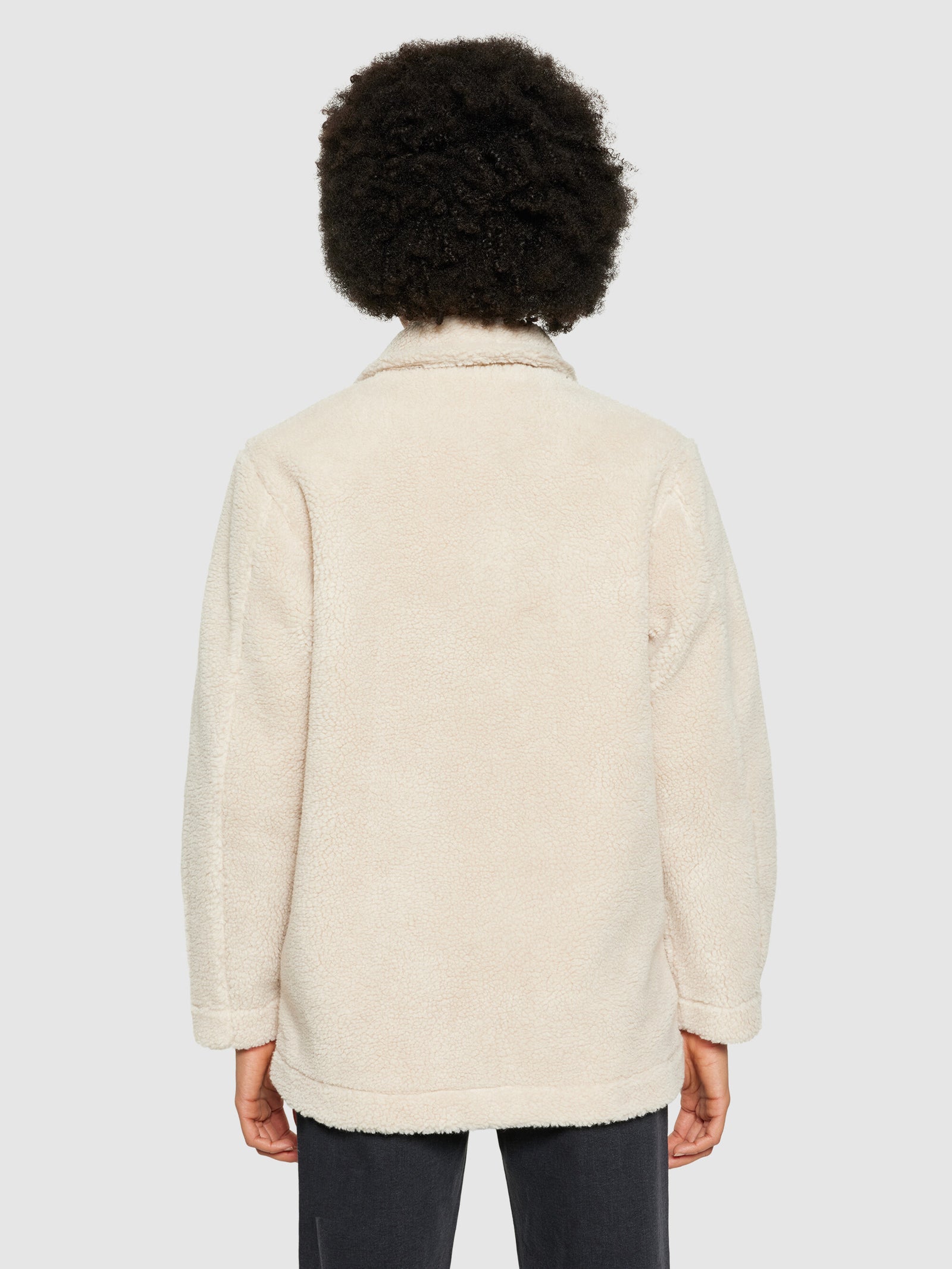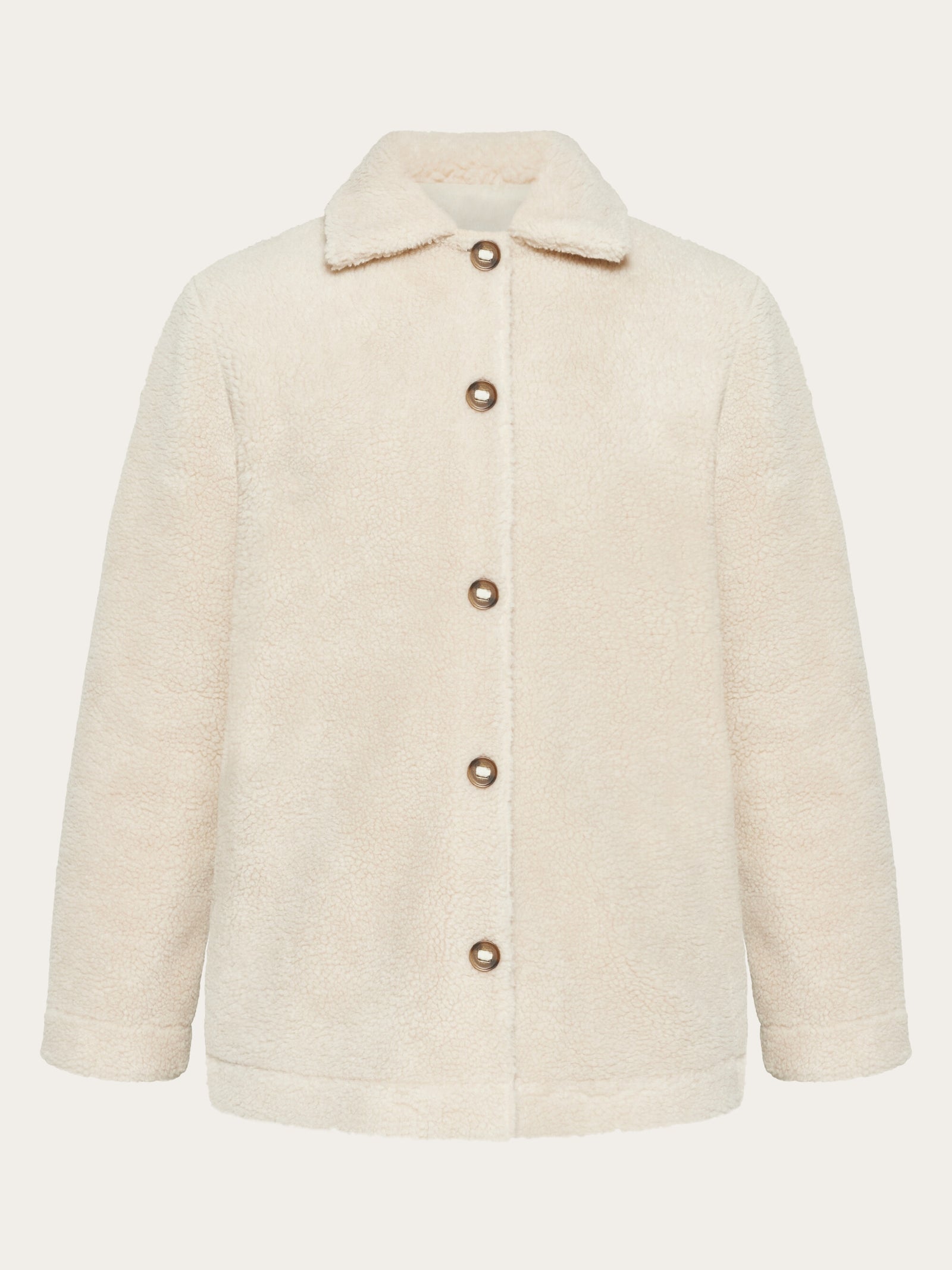 Stay warm and comfortable at all times with our teddy fleece overshirt jacket. It is made from certified 100% recycled polyester in a soft, deep-pile fabric that feels like a fuzzy hug. The jacket is designed in a regular fit with a classic collar, slanted front pockets, and button closure.Style no. 2280012