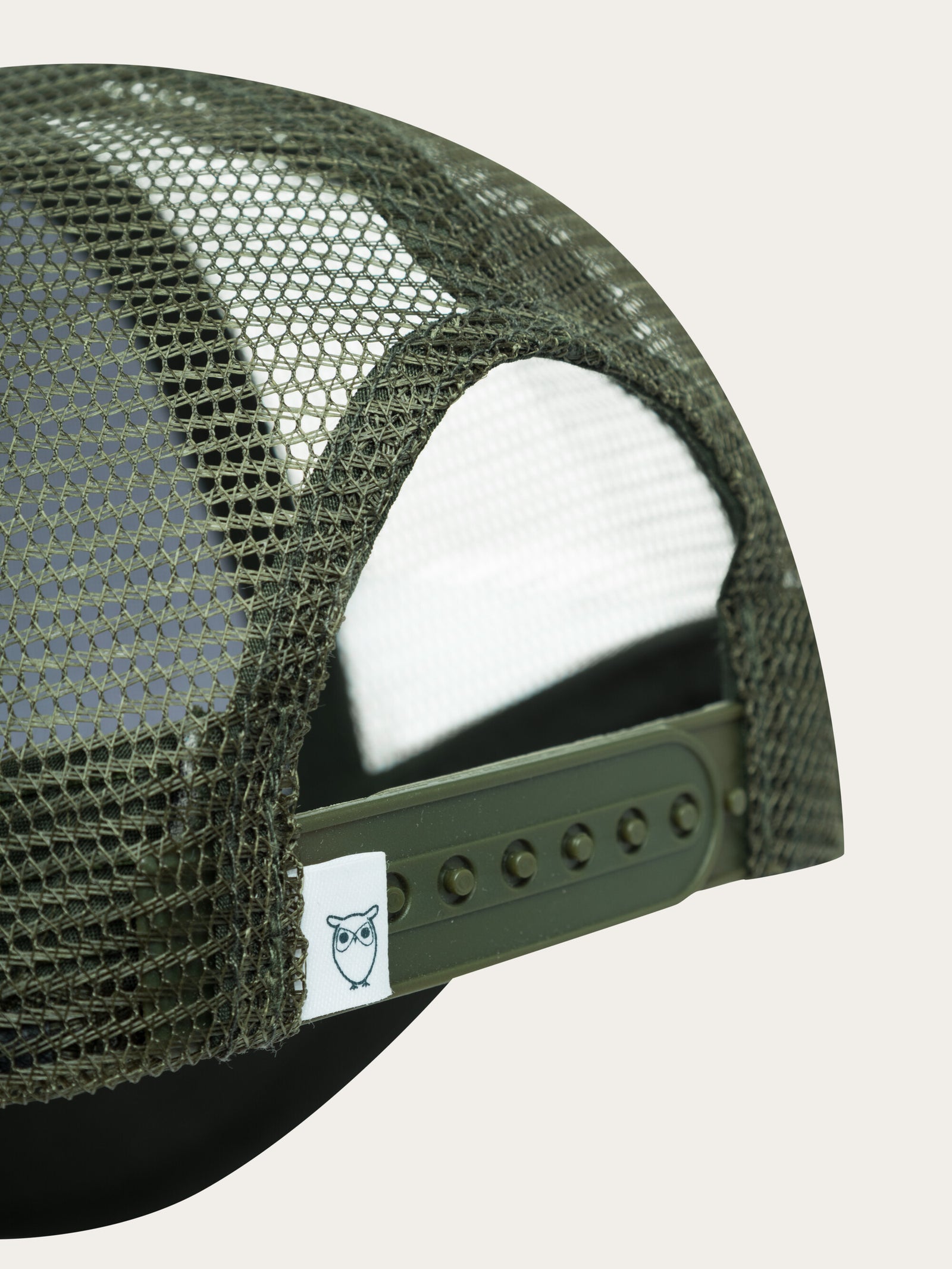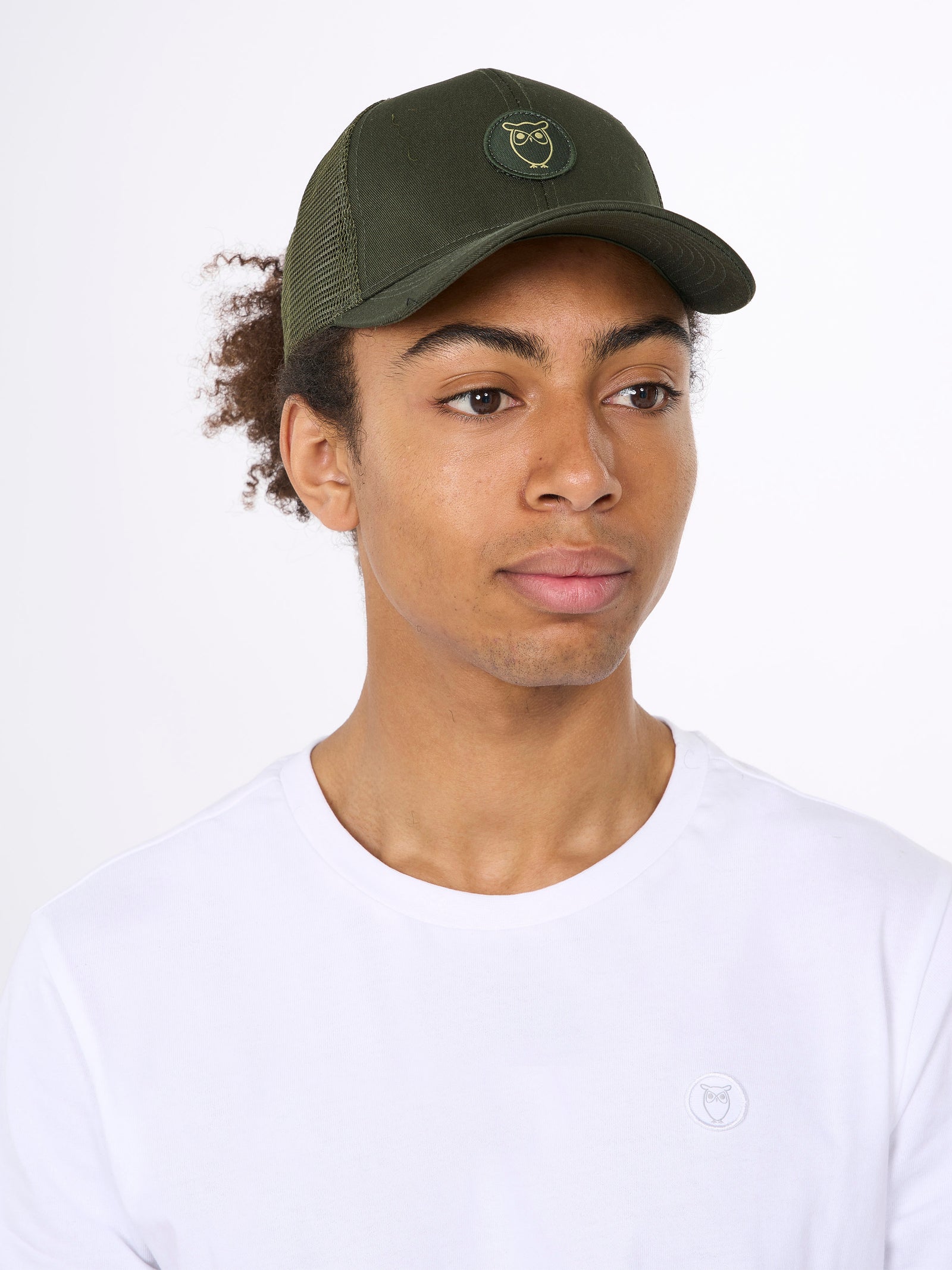 Our twill trucker cap is shaped to a six-panel silhouette in 100% organic cotton. The cap has mesh panels in the back for breathability and is finished with a tonal owl-embroidered patch on the front.Style no. 4230008